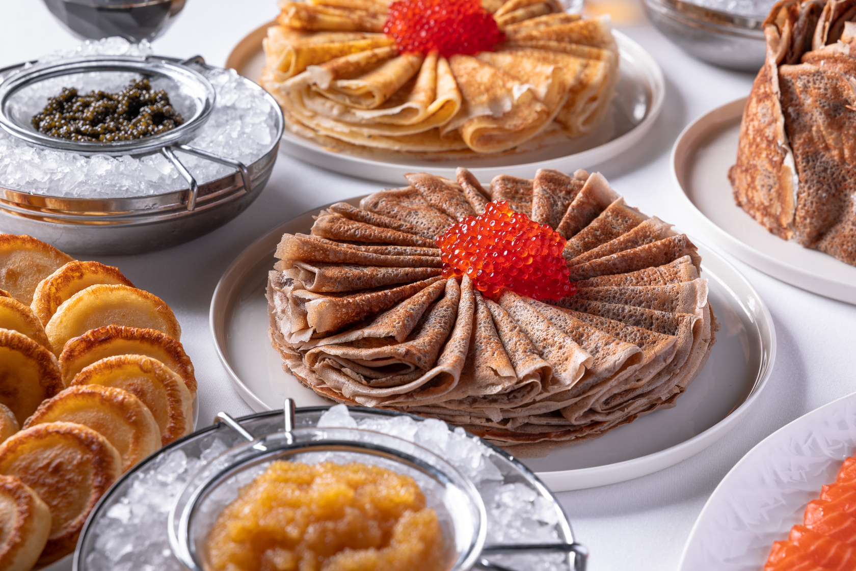 Всю неделю подаем специальное меню. Выбирайте пшеничные или черемуховые блины со сметаной, икрой, лососем.